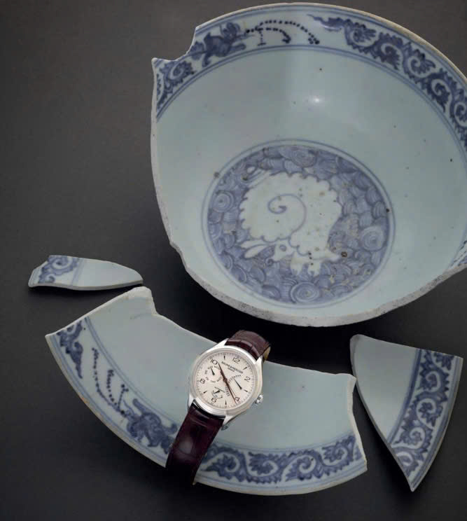 Mảnh vỡ từ chiếc tô bể mang niên đại hơn 350 năm với những chi tiết trang trí hoa dây sống động như nhảy múa uyển chuyển trên vành cùng kỹ thuật vẽ chừa trắng trong lòng tô… tuy không toàn vẹn nhưng đủ biểu đạt nét hoa mỹ, bay bổng, khoáng đạt trong chế tác đồ cổ của người thợ xưa.
