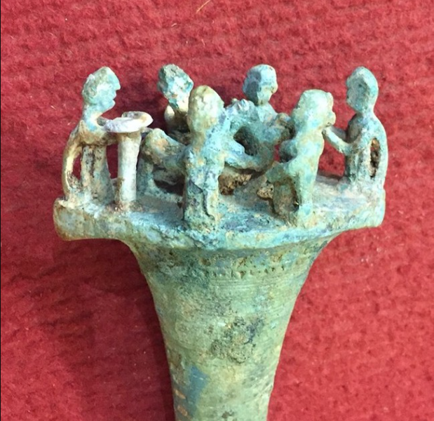 Một “ban lễ nhạc” phổ biến thời Đông Sơn trên một đốc dao găm đồng: Người ngồi xung quanh thổi khèn, sáo và hát, ở giữa là người đánh trống