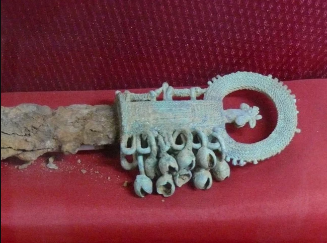 Chuôi đồng của một thanh kiếm Đông Sơn lưỡi sắt với biểu tượng đầu gà trống trong vành khuôn mặt trời mọc, voi gầm và tiếng nhạc chuông reo (sưu tập Hoàng Văn Thông, Thanh Hóa)