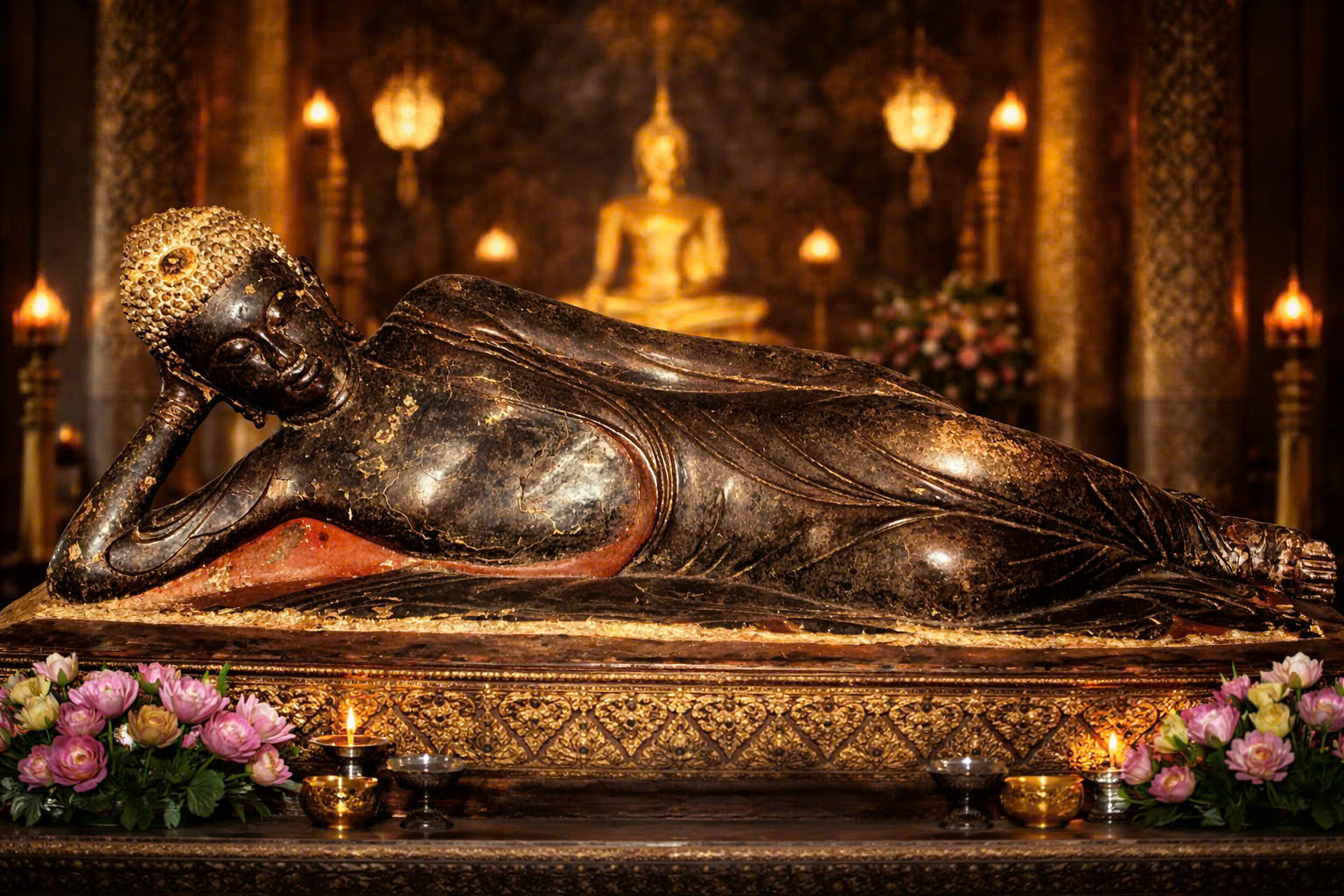 • Tư thế: Đức Phật được thể hiện trong tư thế nằm nghiêng về bên phải (dáng kiết tường), tay phải gối dưới đầu, tay trái duỗi thẳng dọc theo thân mình. Gương mặt toát lên vẻ thư thái, thanh tịnh của bậc giác ngộ khi rời bỏ thân xác thế tục.